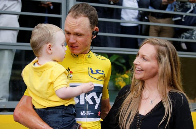 Team Sky rider and yellow jersey Chris Froome of Britain with his