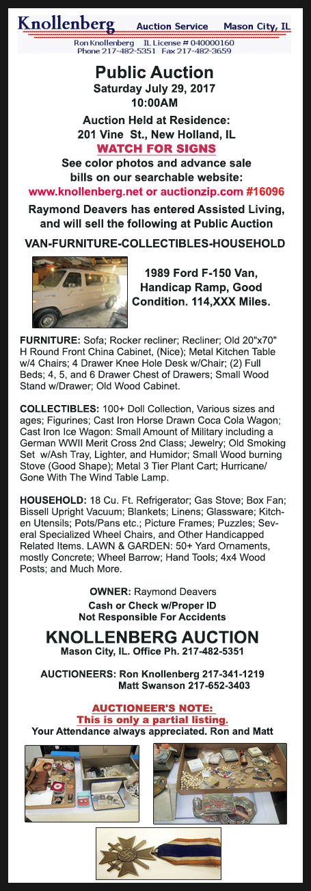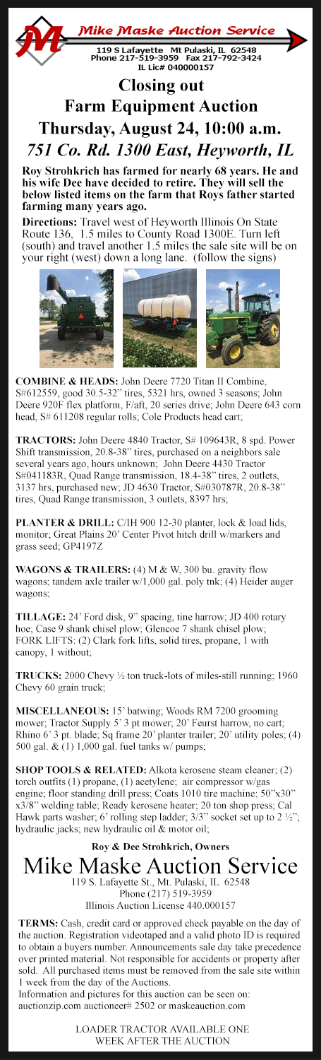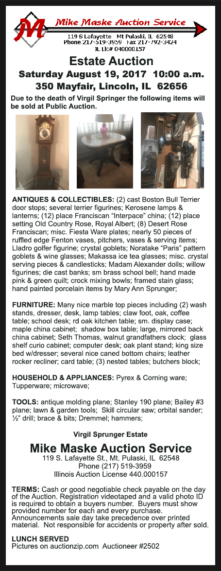 Click on Maske Auction Service ad for sale bills and listings of auctions and goods.