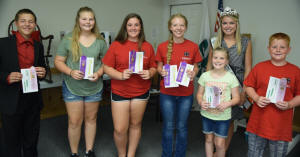 4-H Child Development State Fair Delegates & Alternates: L to R: Cavit Schempp, Klarissa Helton, Mary Carlock, Molly Schempp, Myah Bowman, Winton Carlock (representing Jamie Carlock). Behind: Logan County Fair Queen Michelle Paulus.