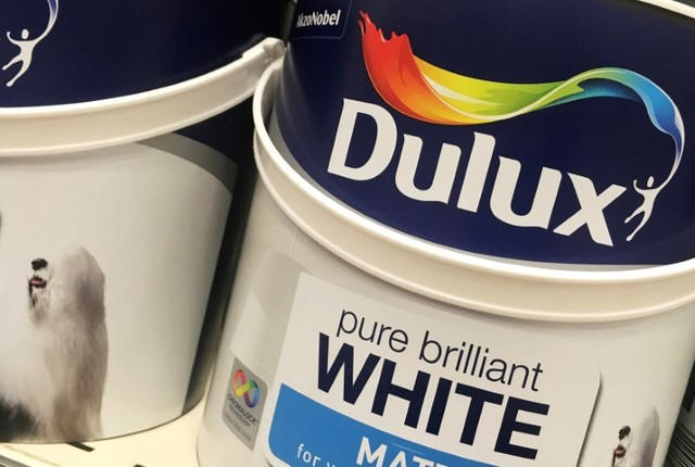 Cans of Dulux paint, an Akzo Nobel brand, are seen on
