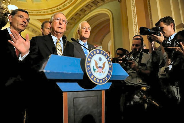 Senate Majority Leader Mitch McConnell, accompanied by Senator John