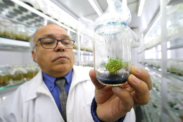 Doctor Gustavo Zuniga holds up an Antarctic plant that has molecules