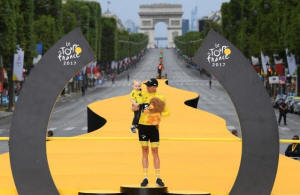 Team Sky rider and yellow jersey Chris Froome of Britain celebrates