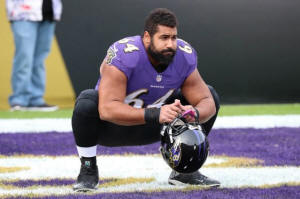 Baltimore Ravens guard John Urschel warms up prior to the game