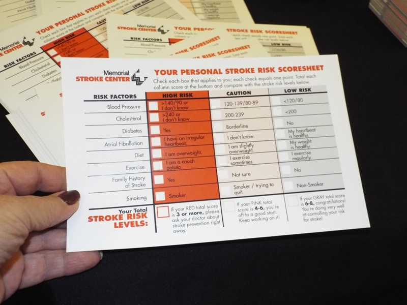 The Stroke Center was also handing out a personal risk score card to help folks visualize the issues that put them at higher risk for stroke. In the high risk category: if blood pressure normally exceeds 140/90, if total cholesterol is greater than 240, if one is diabetic, has an irregular heartbeat, and overweight, there is a danger of stoke in the future. Lack of exercise, smoking, and family history play a large part in the risk as well.