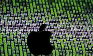 A 3D printed Apple logo is seen in front of a displayed cyber code