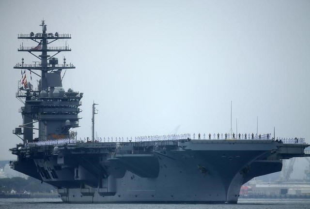 Sailors man the rails as aircraft carrier USS Nimitz with Carrier