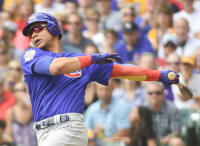 Cubs catcher Willson Contreras (40) drives in a run with an