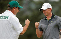 Rory McIlroy of Northern Ireland bumps fists with his caddie