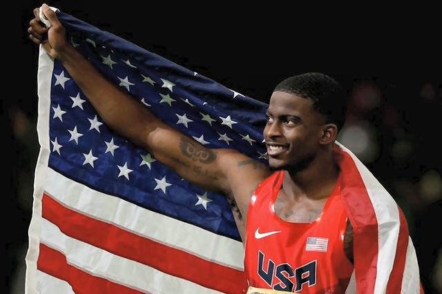 Trayvon Bromell of the U.S. celebrates with an American flag