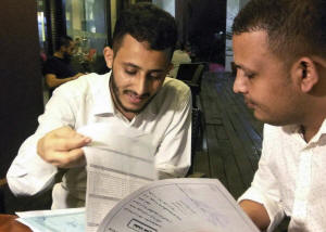 Zaid, 26 look through documents as they speak with Reuters in