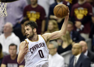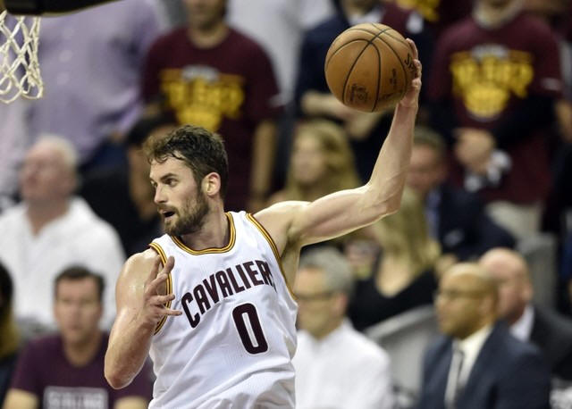 Cavaliers forward Kevin Love (0) rebounds in the third quarter
