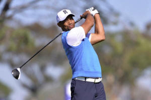 Tiger Woods tees off the 5th hole during the first round of the