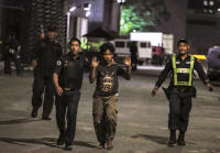 Policemen and a security guard escorting a hotel worker is seen