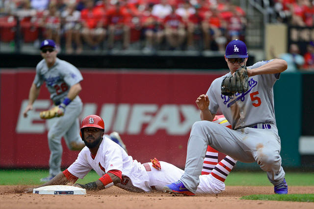 Cardinals center fielder Dexter Fowler (25) steals second as Los
