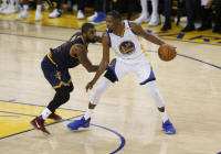 Warriors forward Kevin Durant (35) is defended by Cleveland