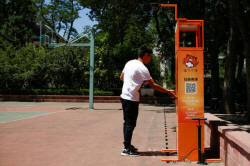 A man uses a court-side basketball vending machine at the Beijing