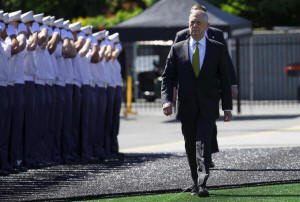 Secretary of Defense James Mattis walks past saluting cadets as he
