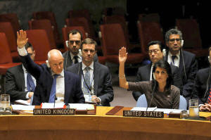 U.S. Ambassador to the U.N. Nikki Haley (R) vote on a U.N. Security