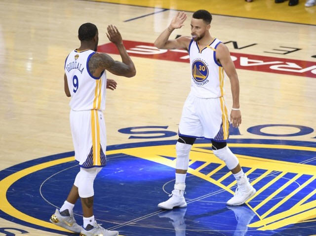 Warriors guard Stephen Curry (30) celebrates with forward Andre