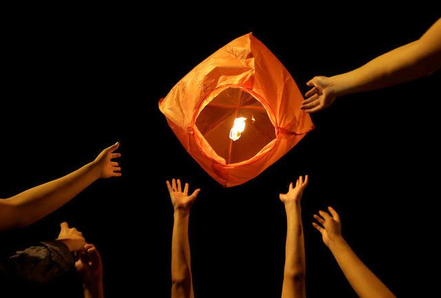 Students release a sky lantern to