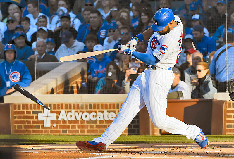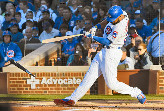 fielder Jason Heyward (22) breaks his bat during an at