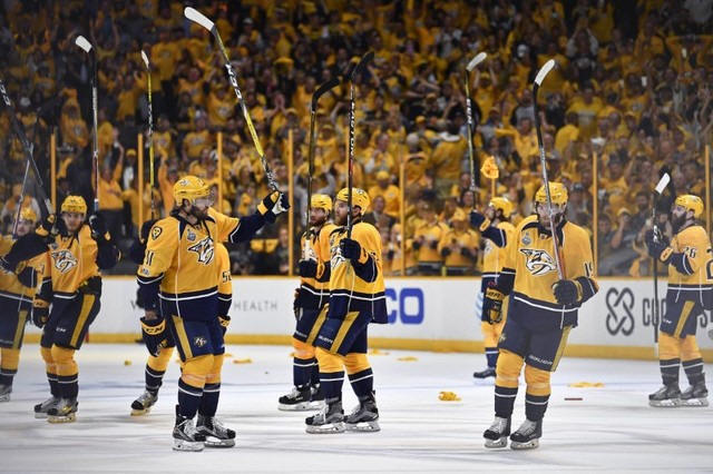 Predators celebrate defeating the Pittsburgh Penguins in game