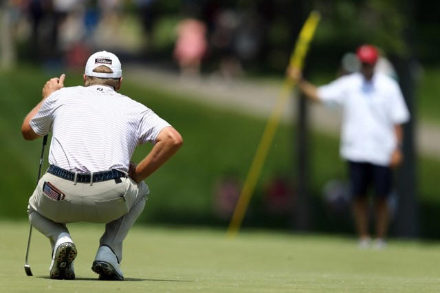 Steve Stricker lines up his putt on the eighth green during the
