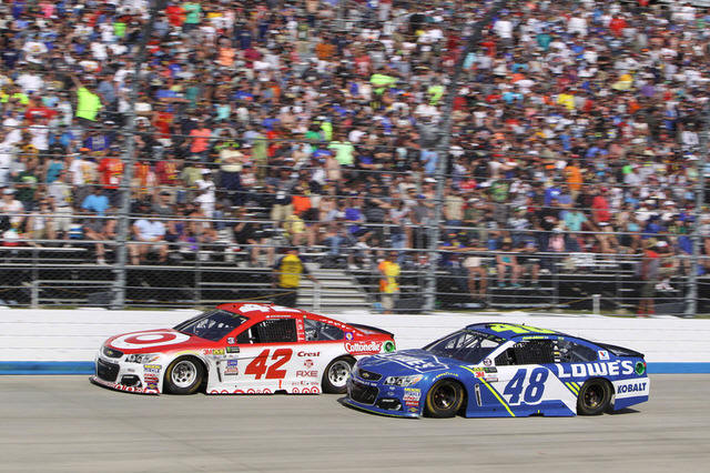races alongside of driver Kyle Larson (42) during the AAA 400