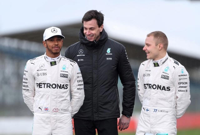 Mercedes' Lewis Hamilton, Executive Director Toto Wolff and Valtteri