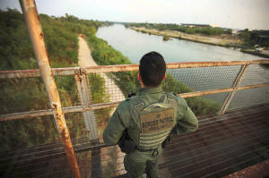 A U.S. border patrol agent looks over the Rio Grande river at the