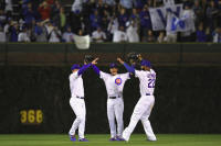 Cubs left fielder Ian Happ (left), center fielder Albert Almora