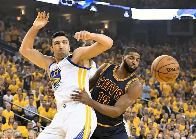Cavaliers center Tristan Thompson (13) battles for the ball with