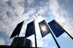Flags in front of the European Central Bank (ECB) before a news