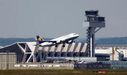 A plane of Germany's air carrier Lufthansa takes off at Fraport
