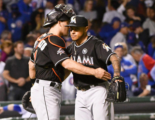 Marlins relief pitcher AJ Ramos (44) hugs Miami Marlins catcher J.T.