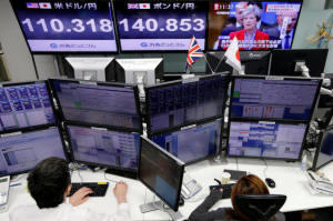 against the British pound (C) and the U.S. dollar (L) in Tokyo,