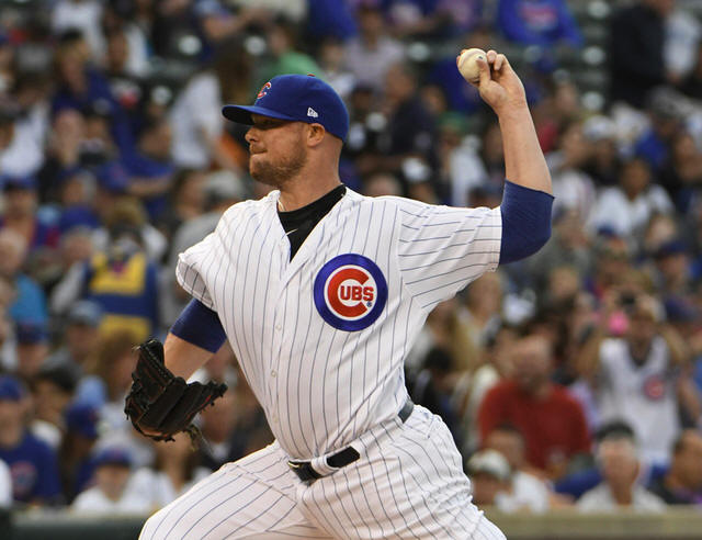 Cubs starting pitcher Jon Lester (34) throws the ball against the