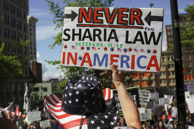 A protester holds a sign during an anti-Sharia rally in Seattle,