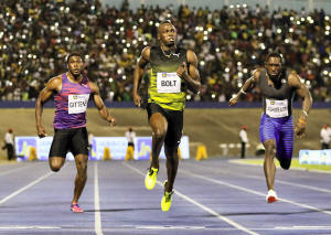 Jamaica's Olympic champion Usain Bolt (C) crosses the finish line as