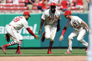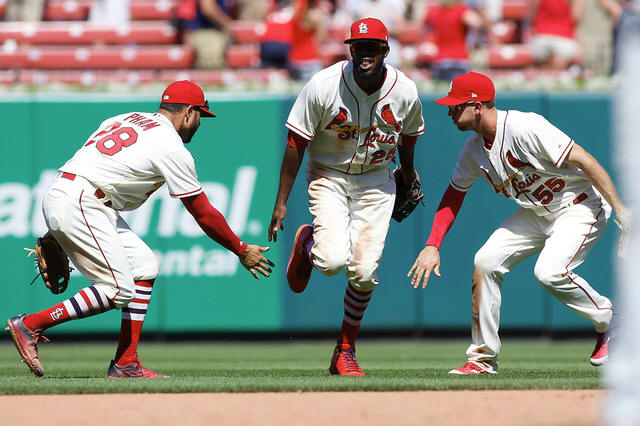 Cardinals left fielder Tommy Pham (28), center fielder Dexter Fowler