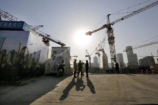 Workers chat outside a construction site in Beijing's central