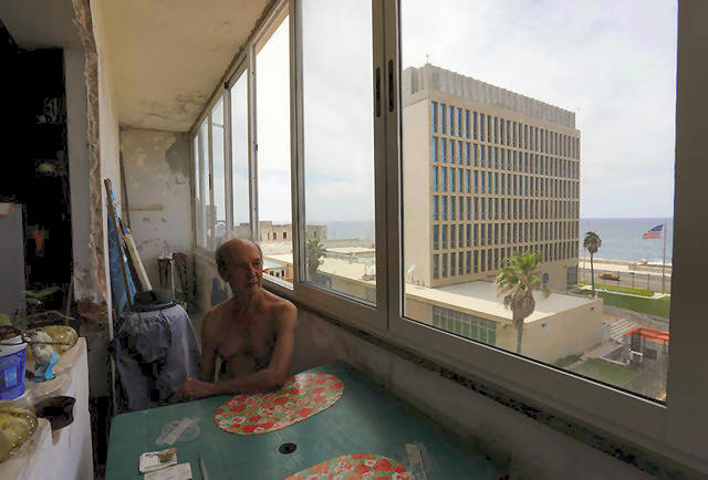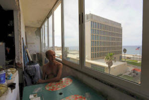 A man sits in his apartment across from the U.S. embassy in Havana,