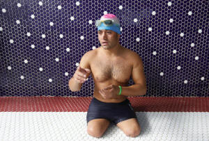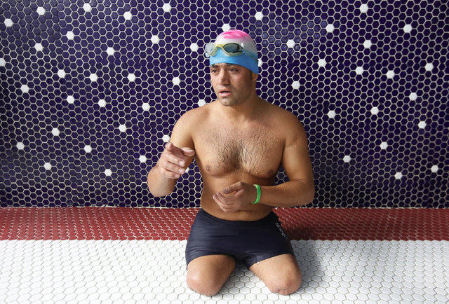 Malik Mohammad 24, arrives for a training in a swimming pool in