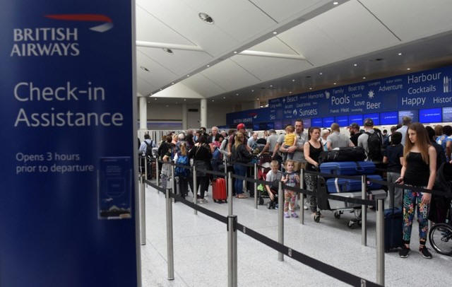 People queue with their luggage for the British Airways