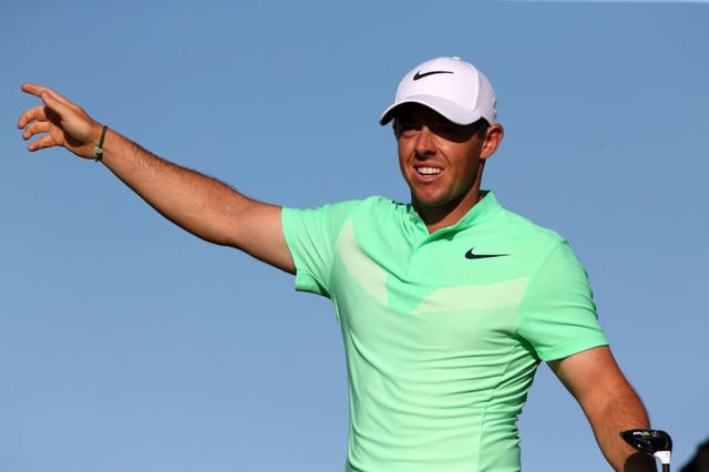 Rory McIlroy reacts to his shot from the 15th tee during the first
