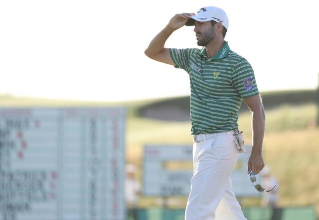 Adam Hadwin tips his cap after finishing on the 9th green during the