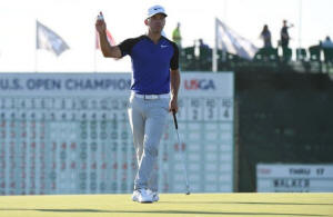 Casey waves to the crowd after his birdie putt on the 18th green