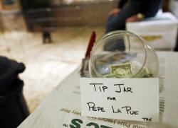A tip jar is seen at the Dog salon inside the Hotel Pennsylvania in