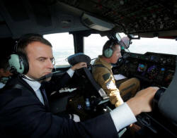 French President Emmanuel Macron sits in the cockpit of an Airbus